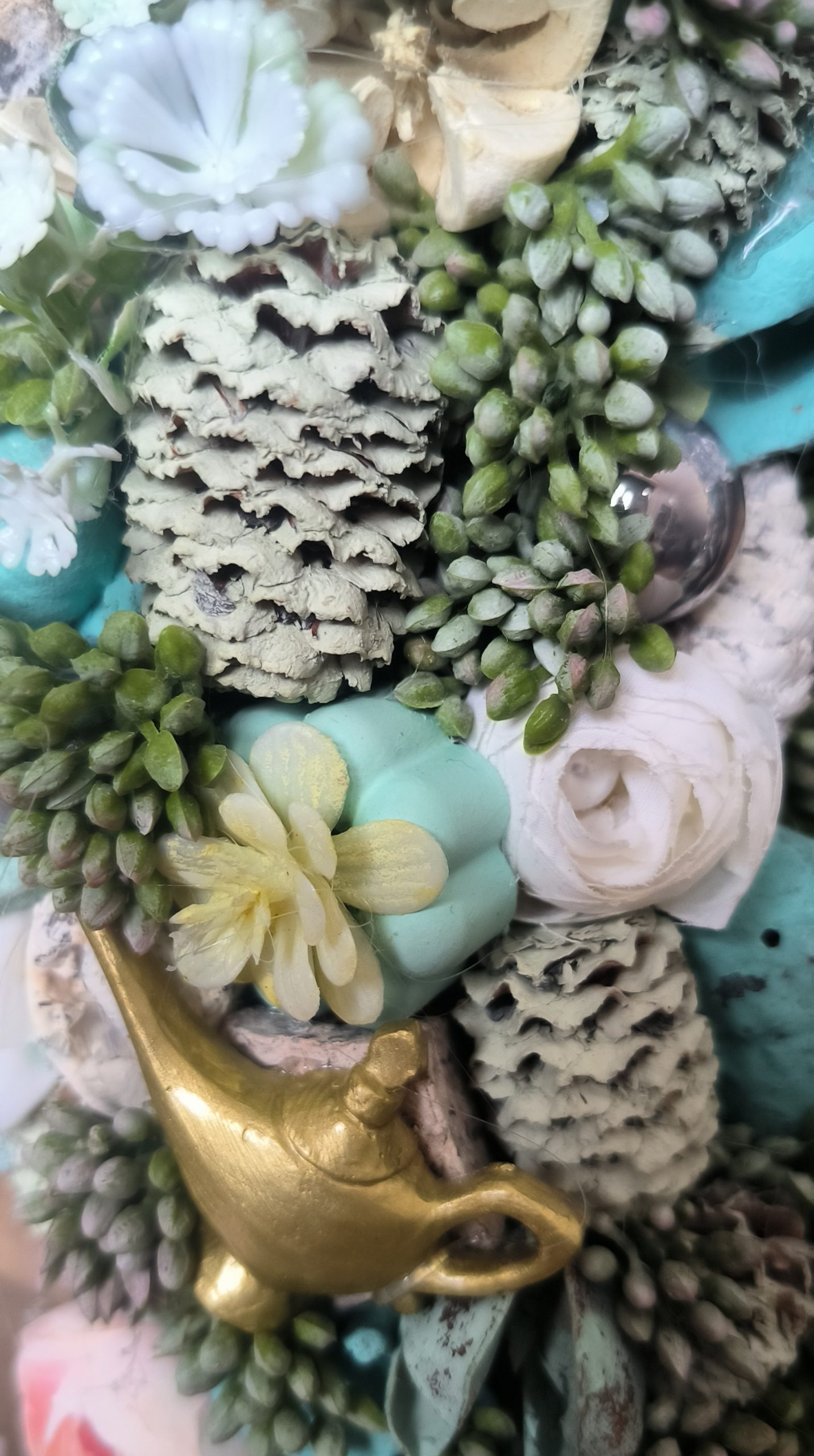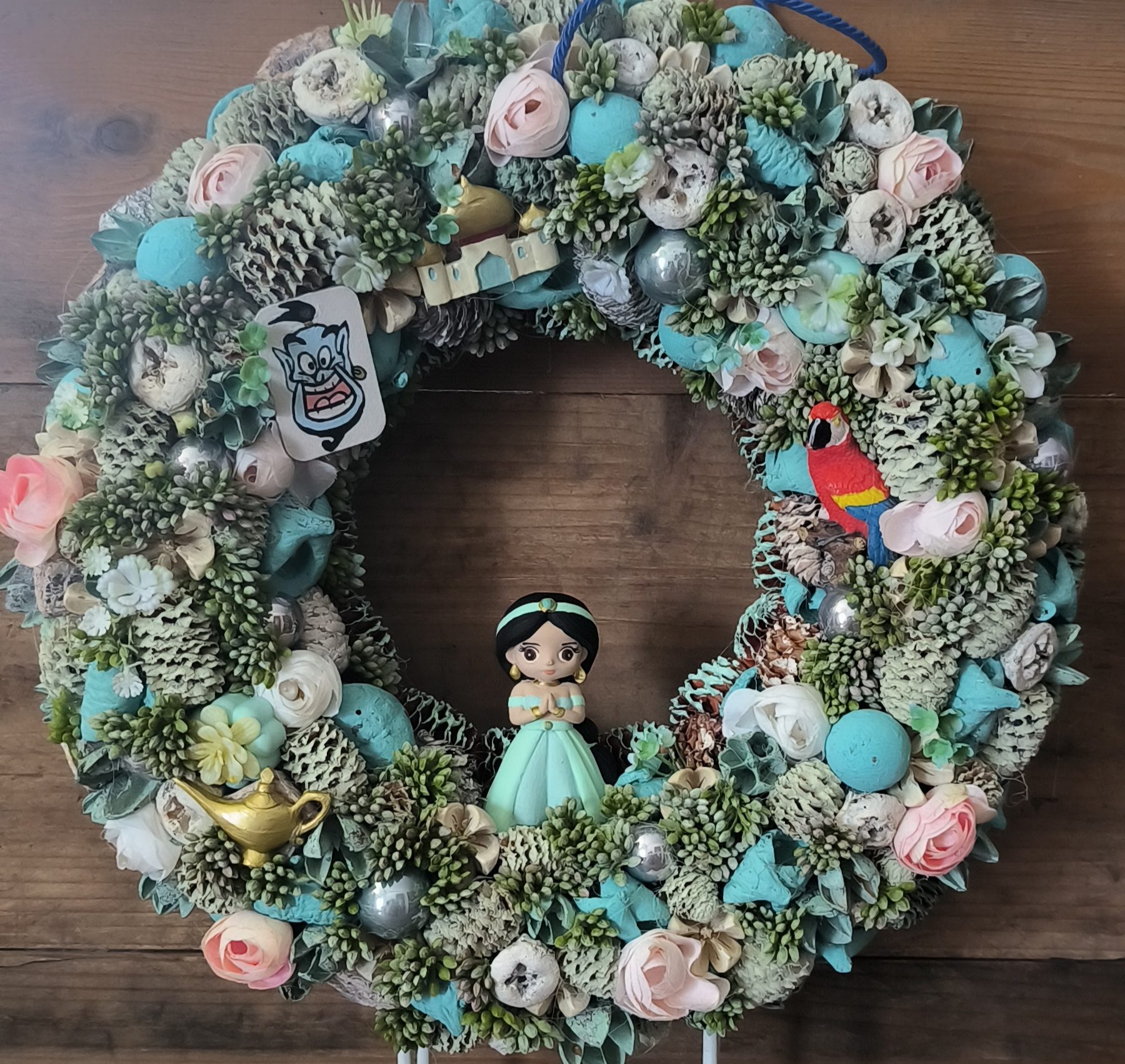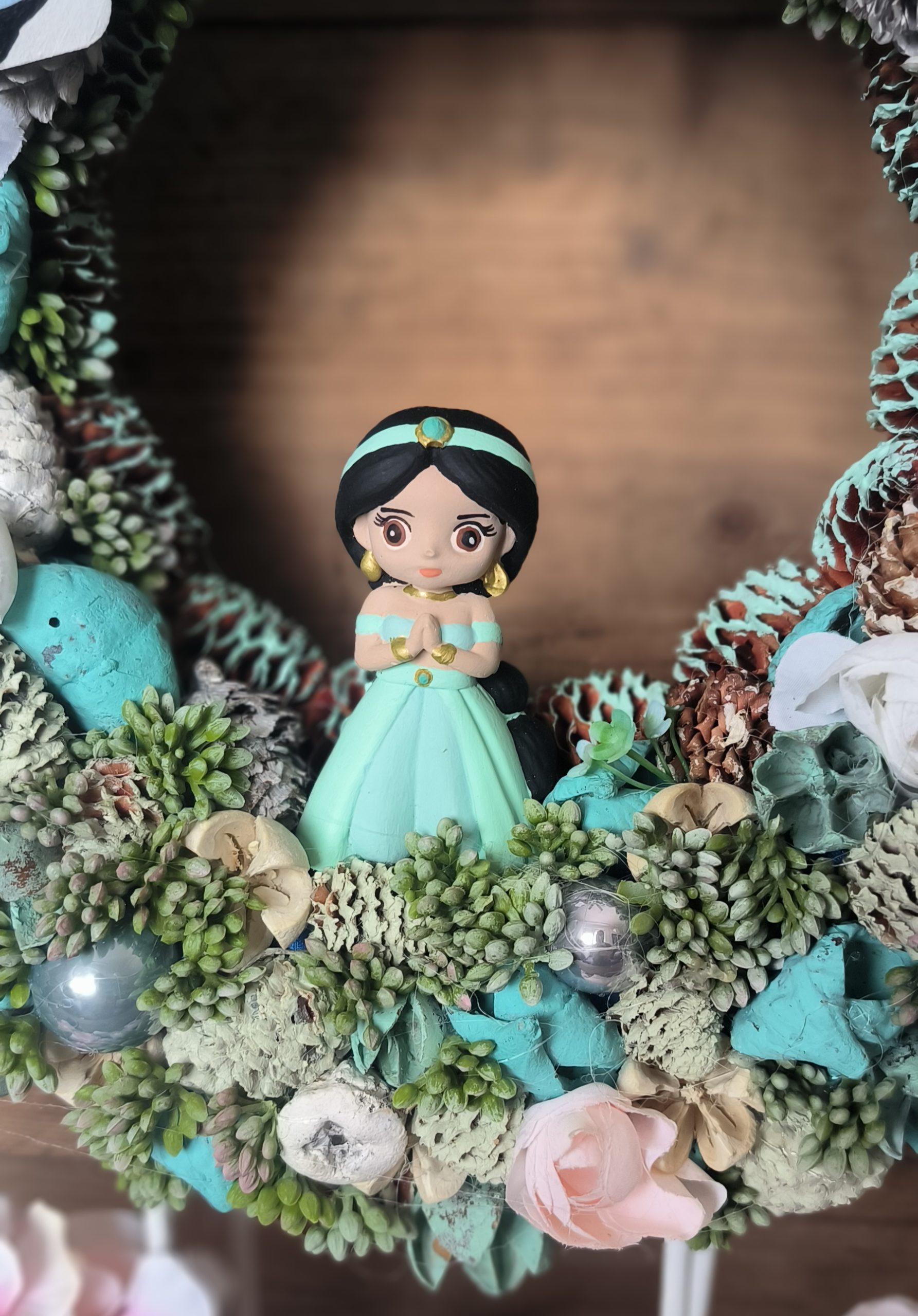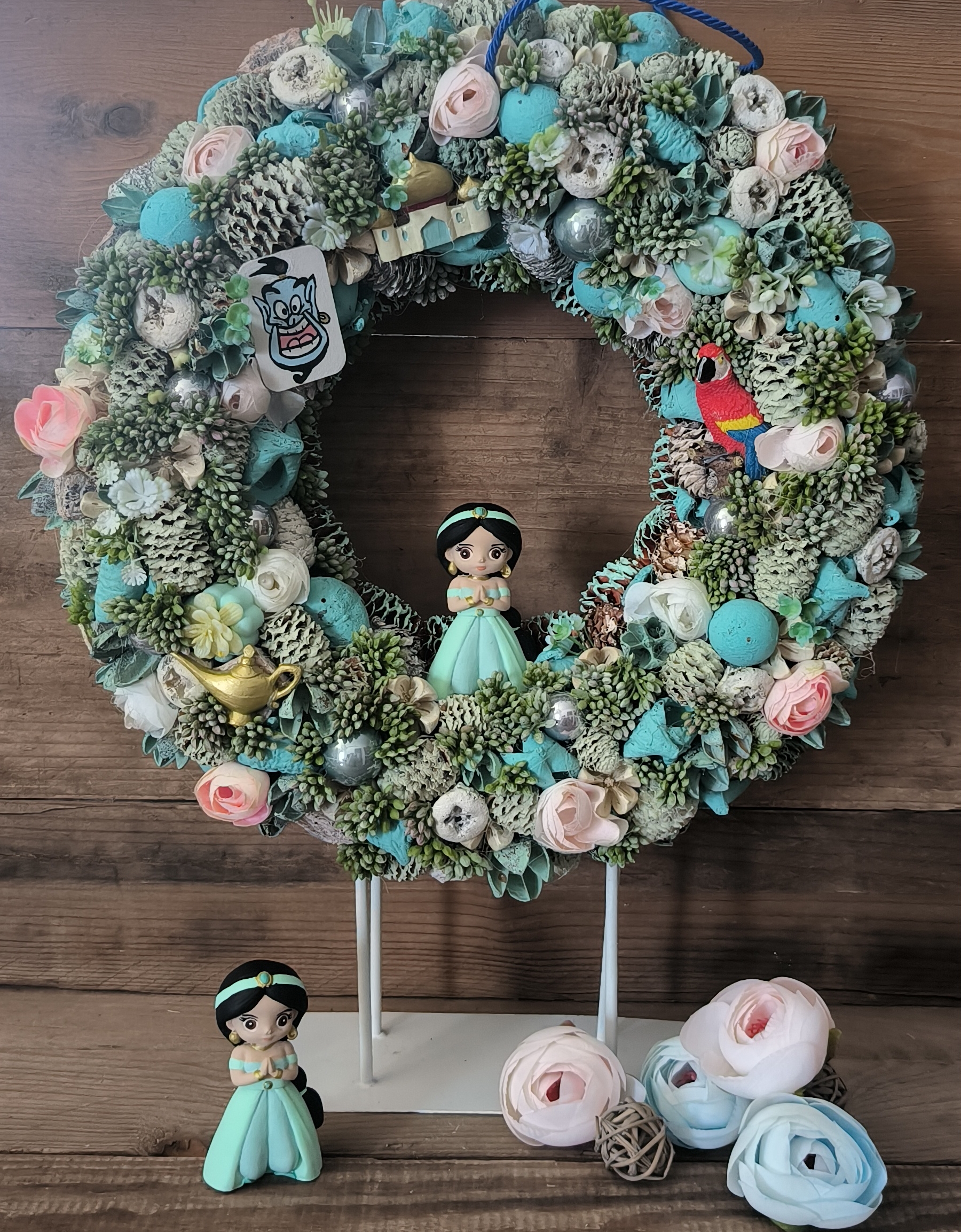 Készült egy Aladdin–inspirálta kopogtató, amely minden részletével a mesébe repít. A 35 cm átmérőjű dekoráció finom pasztellszínekkel, kézzel készített díszekkel és aprólékos, tematikus elemekkel idézi meg a varázslatos Agrabah világát. 🕌🌟