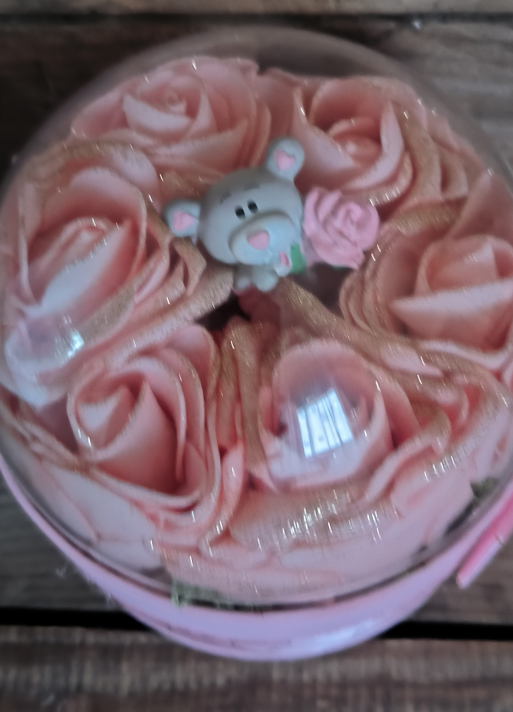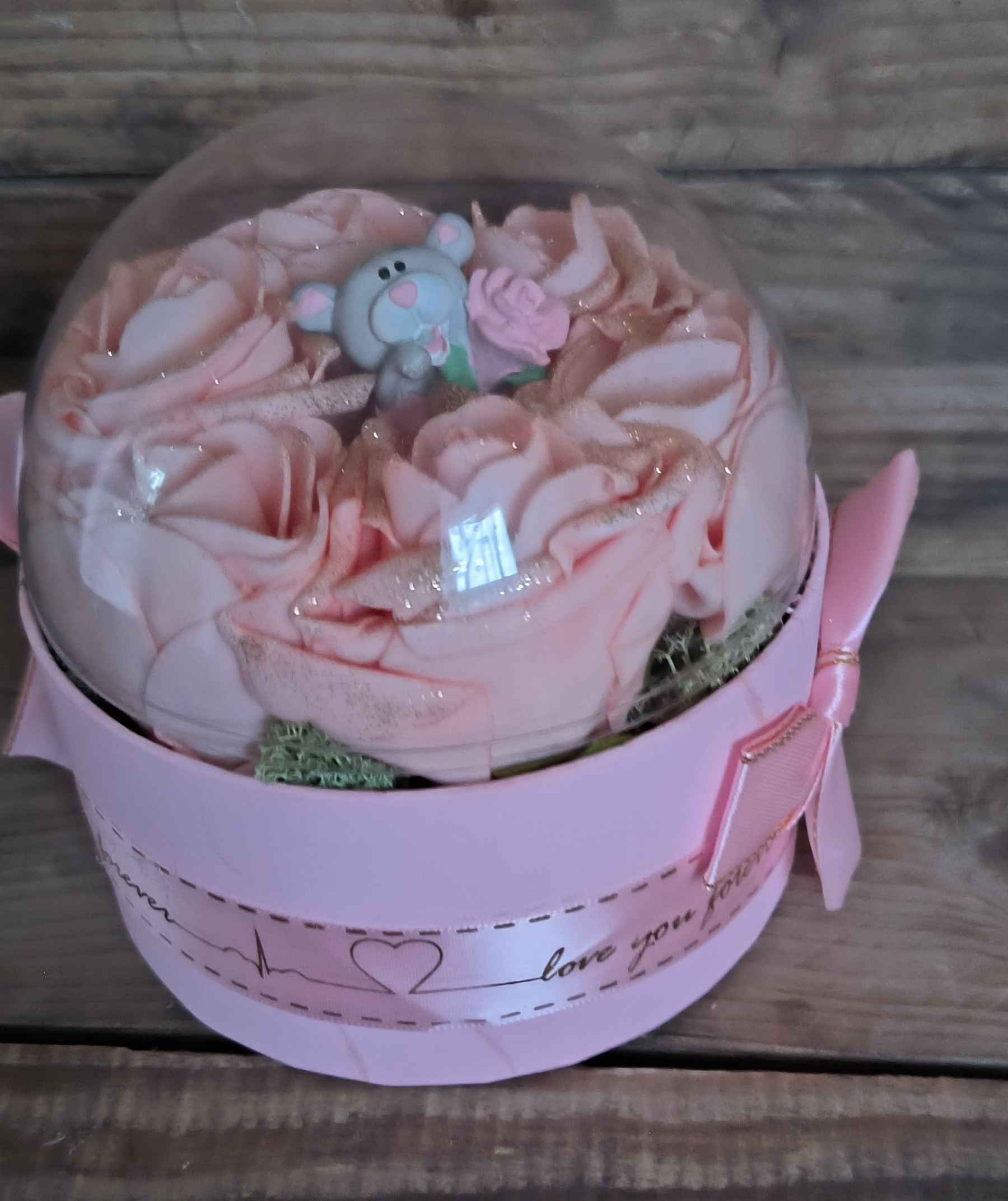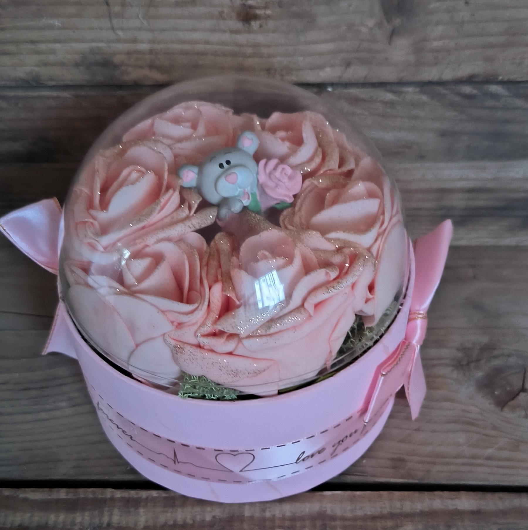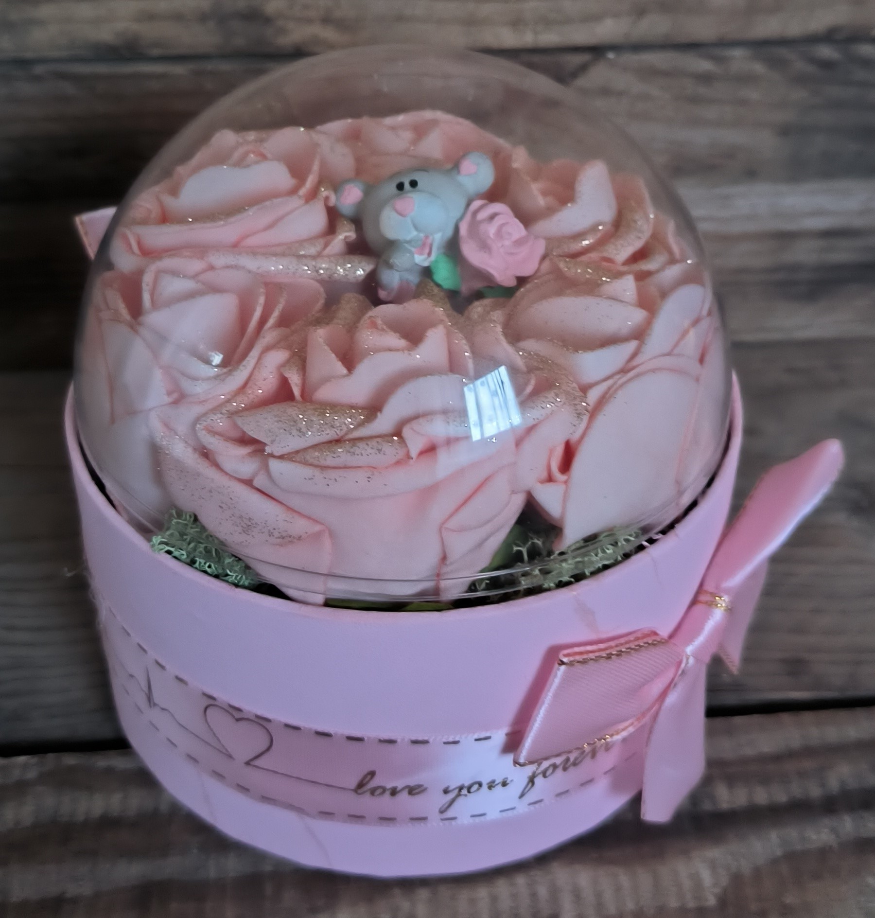 Selyemvirágos rózsabox, csillámmal és macival díszítve