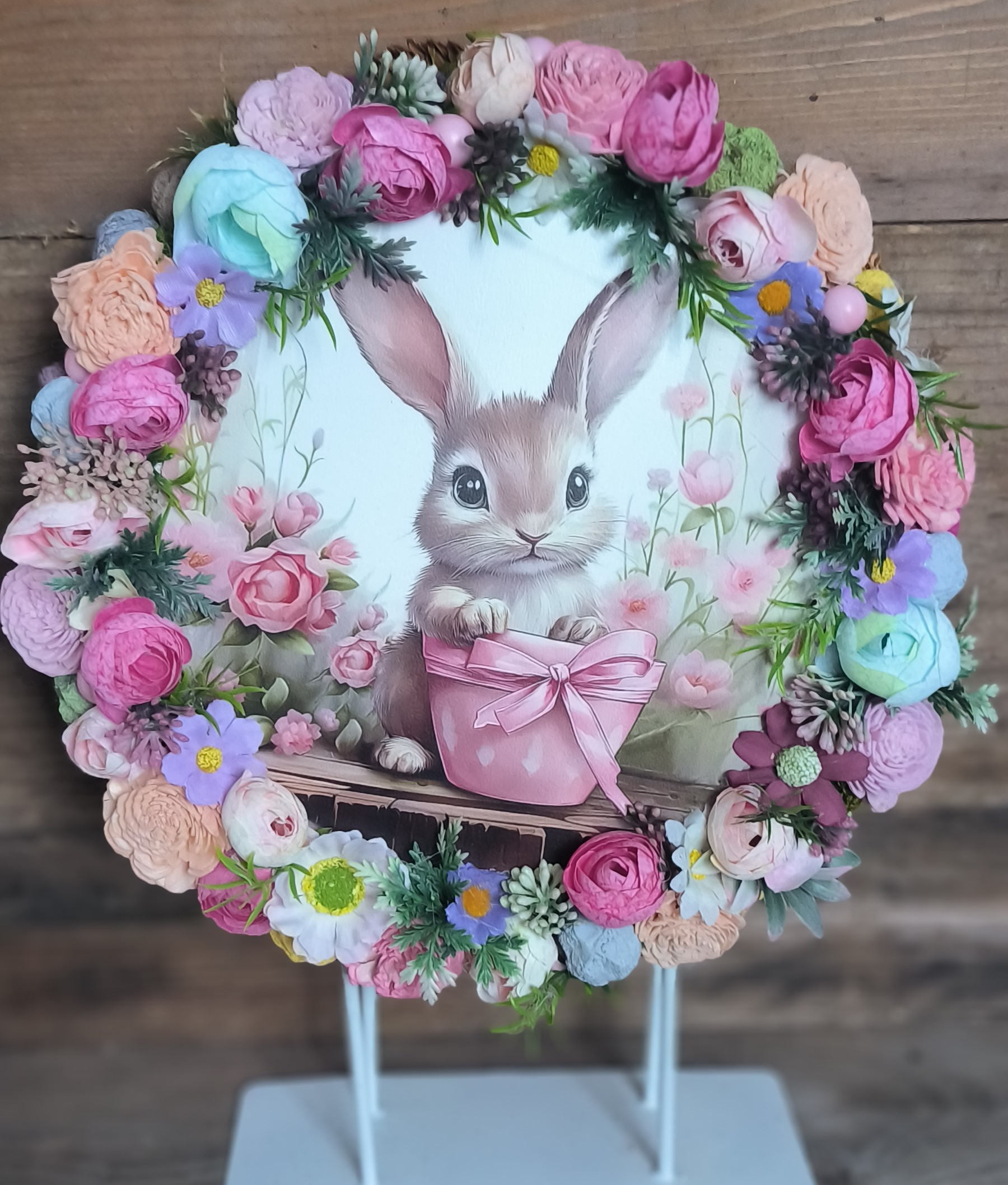 Ez a gyönyörű koszorú tele van színes, puha hangulatú virágokkal, középen pedig egy aranyos kis nyuszi kukucskál elő a rózsaszín cserepéből. Igazi tavaszi, vidám dekoráció, ami garantáltan feldobja az ajtót, falat vagy bármelyik polcot.