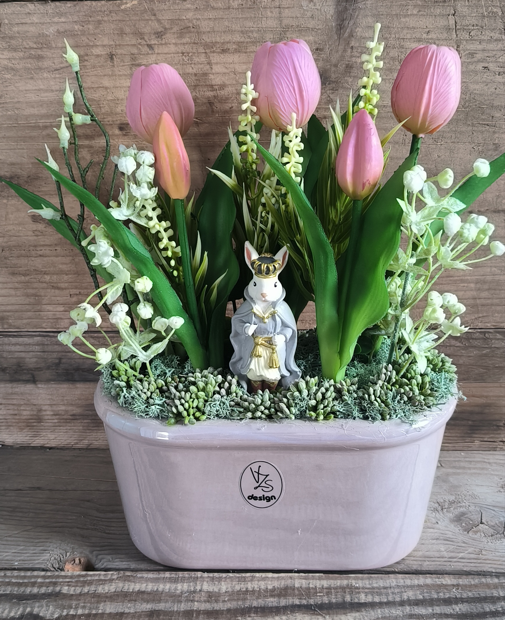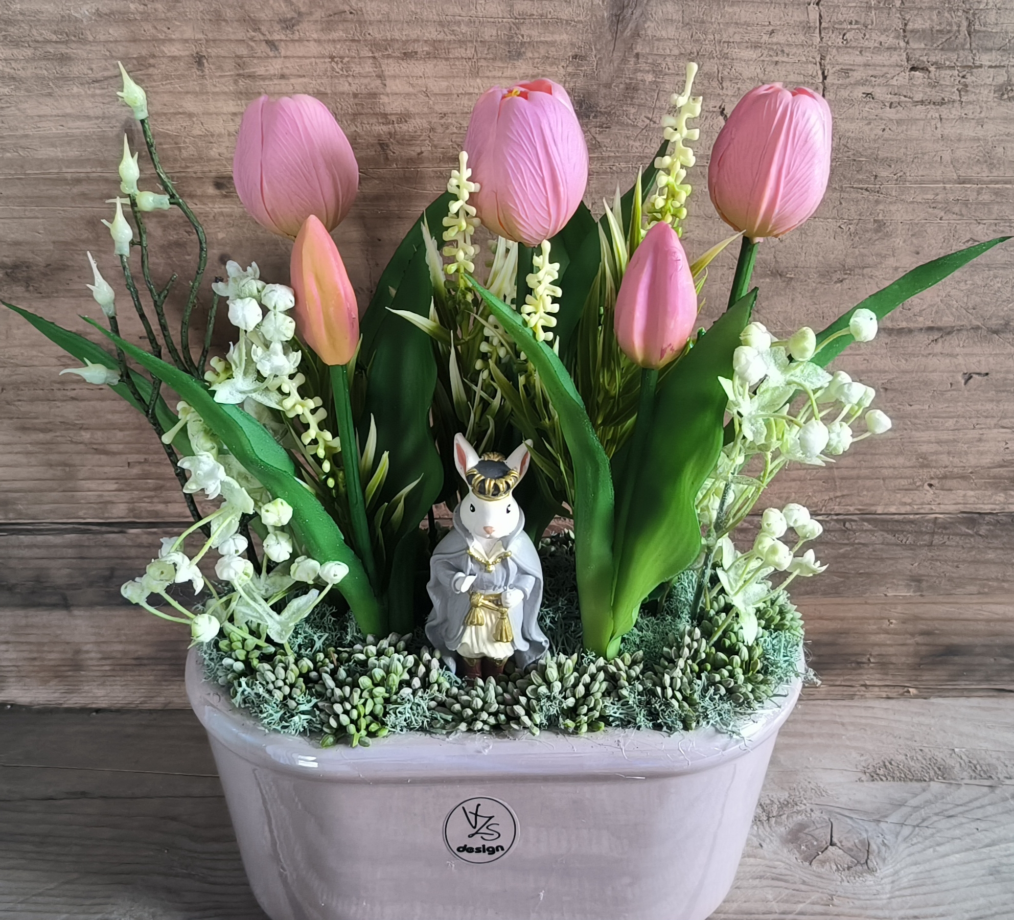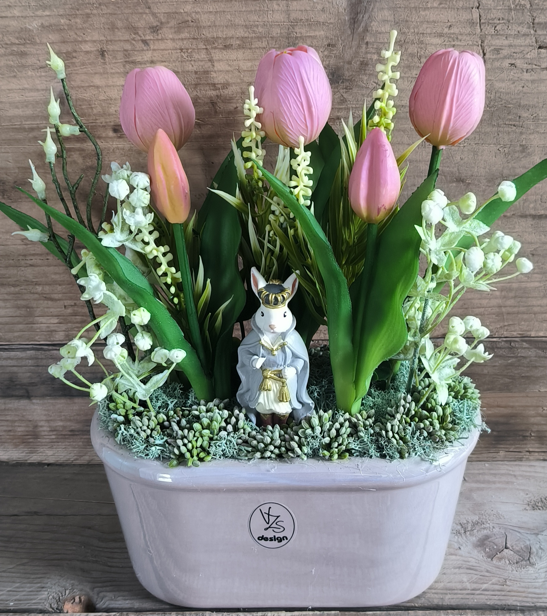 Megérkezett egyik legújabb díszem: a rózsaszín tulipánok között megbújó kis koronás nyuszi, aki igazi eleganciát csempész a lakásba. 😍