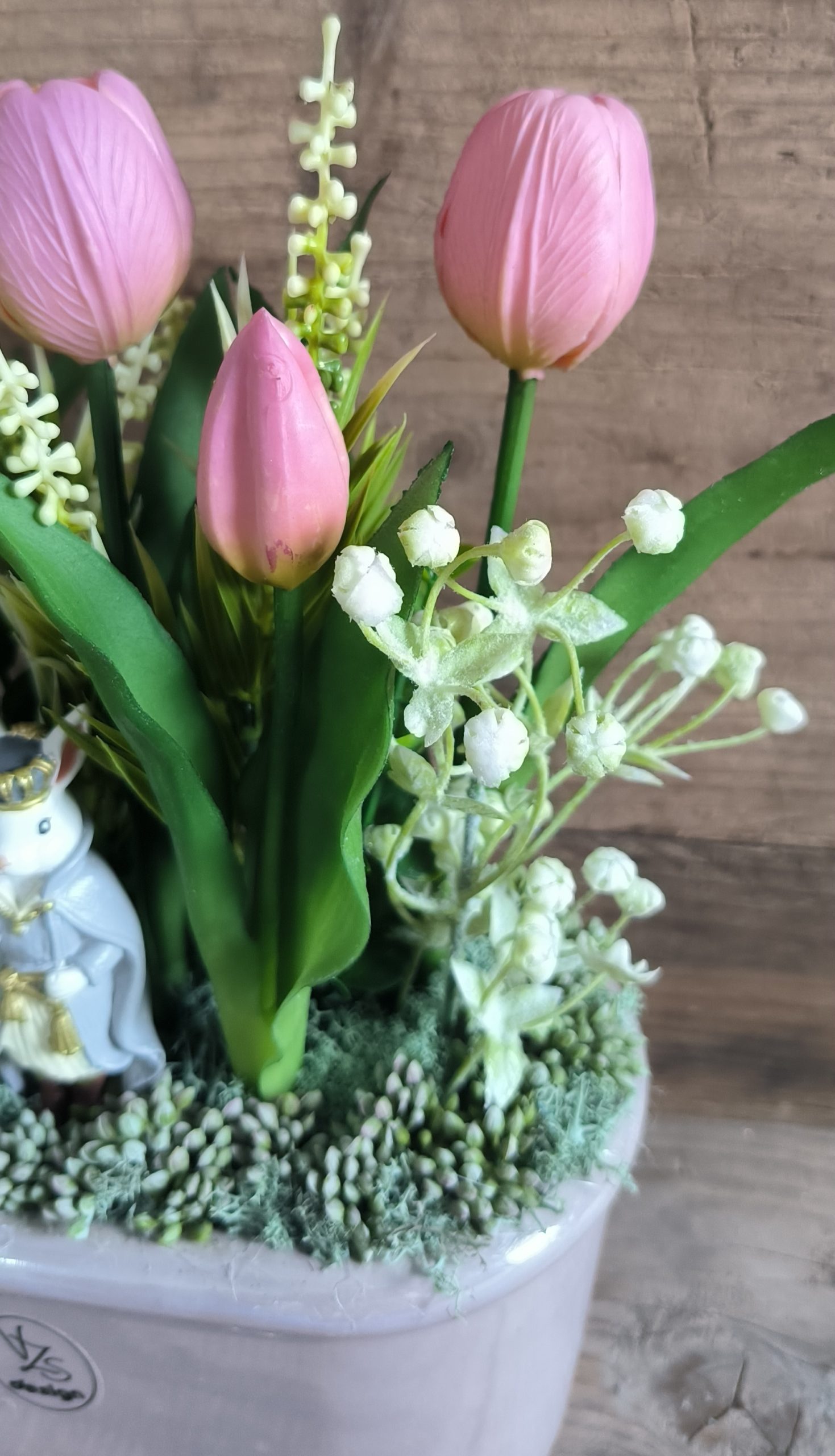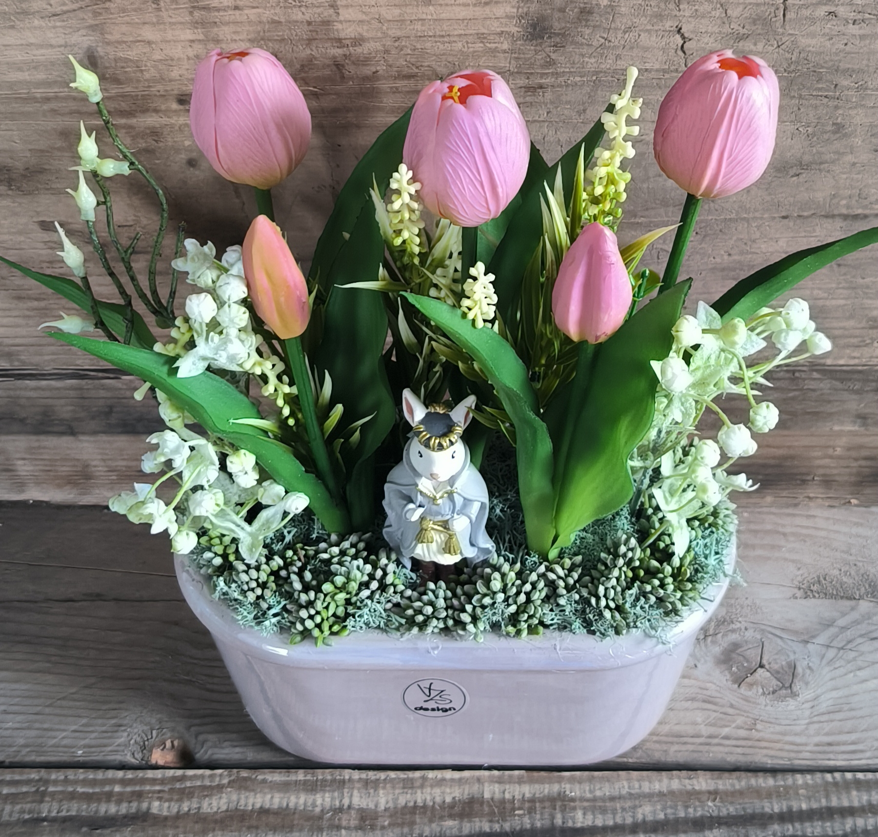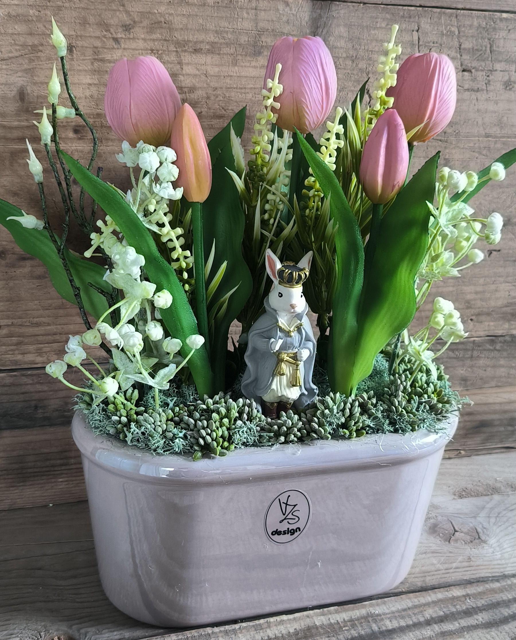 Megérkezett egyik legújabb díszem: a rózsaszín tulipánok között megbújó kis koronás nyuszi, aki igazi eleganciát csempész a lakásba. 😍
