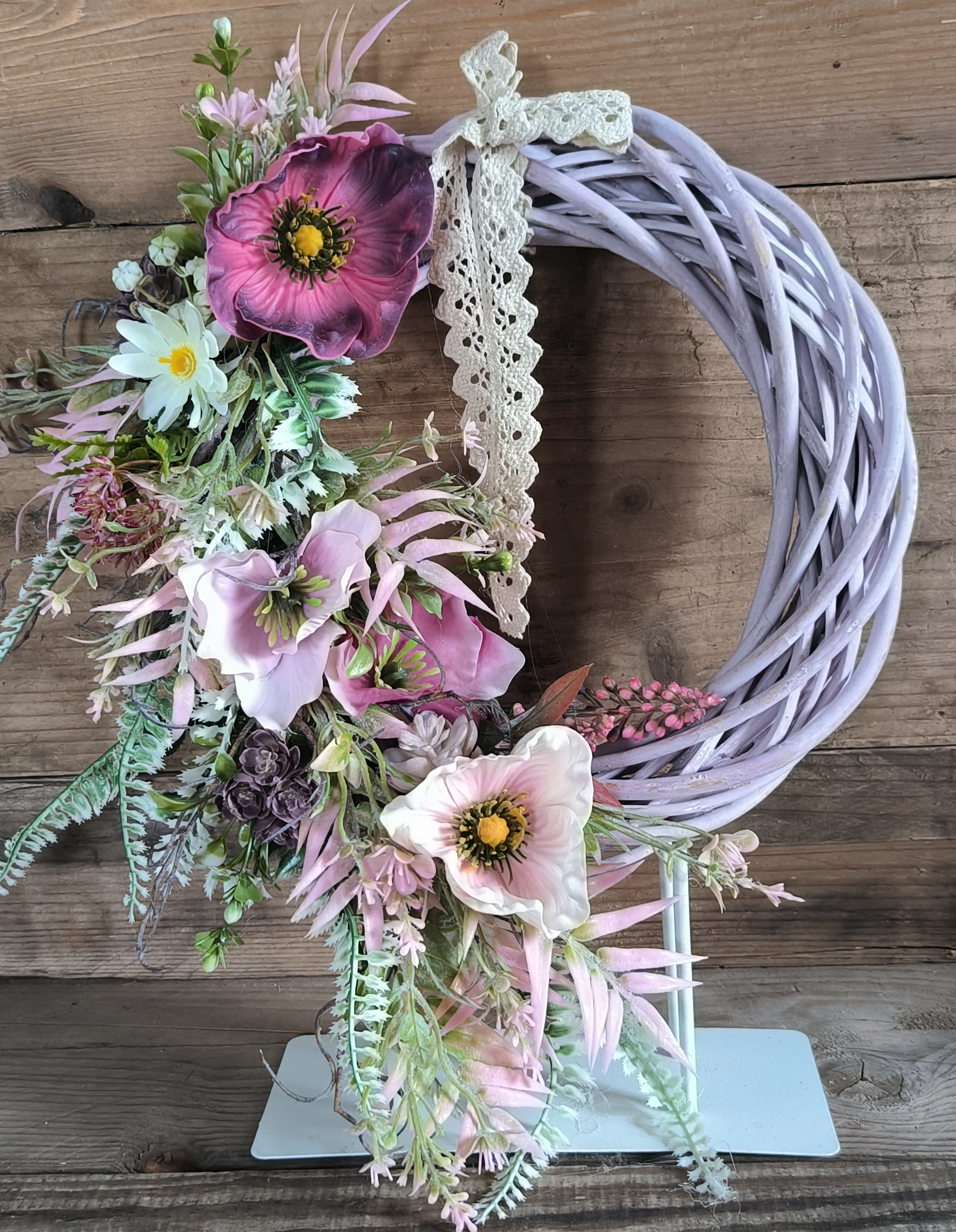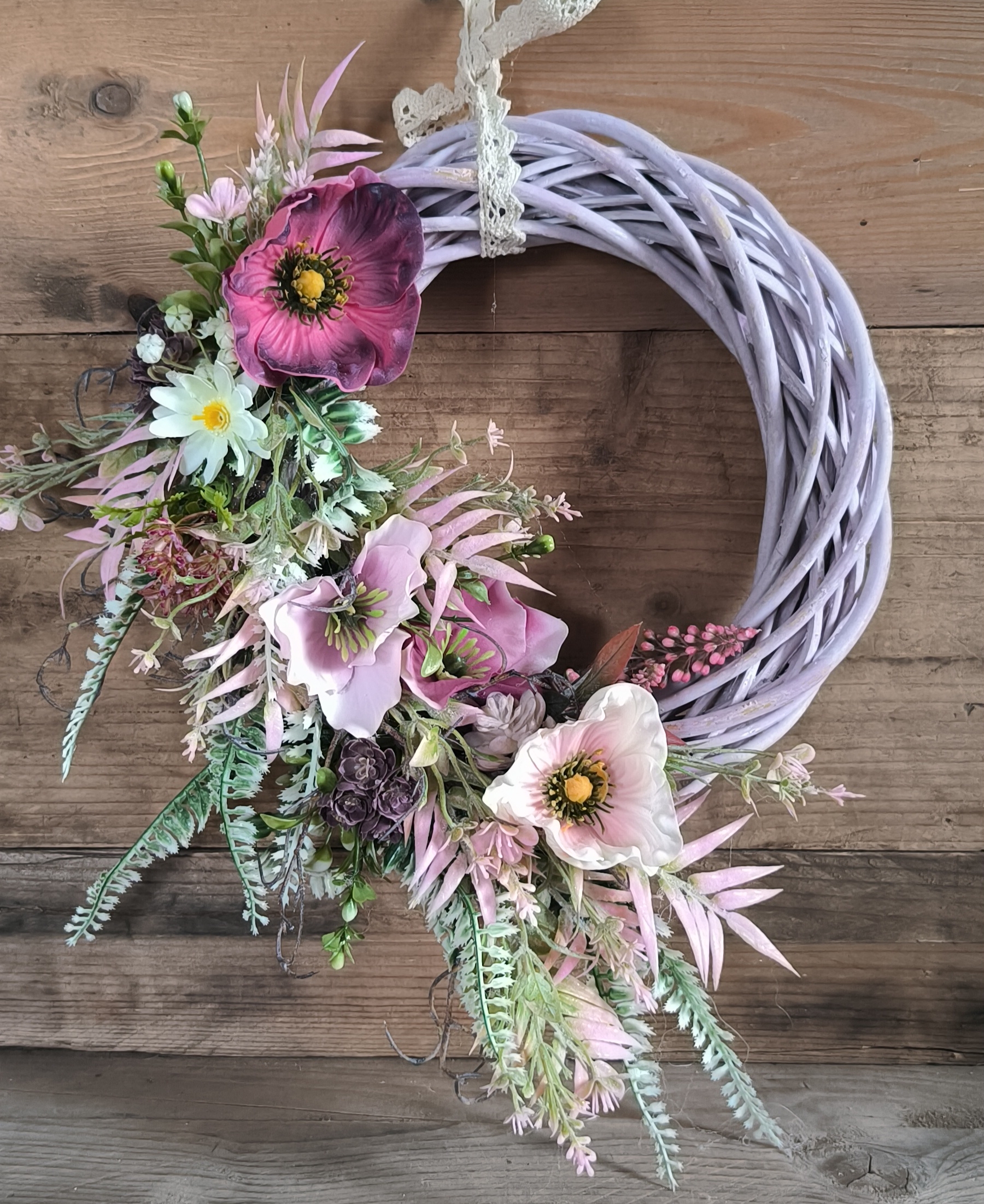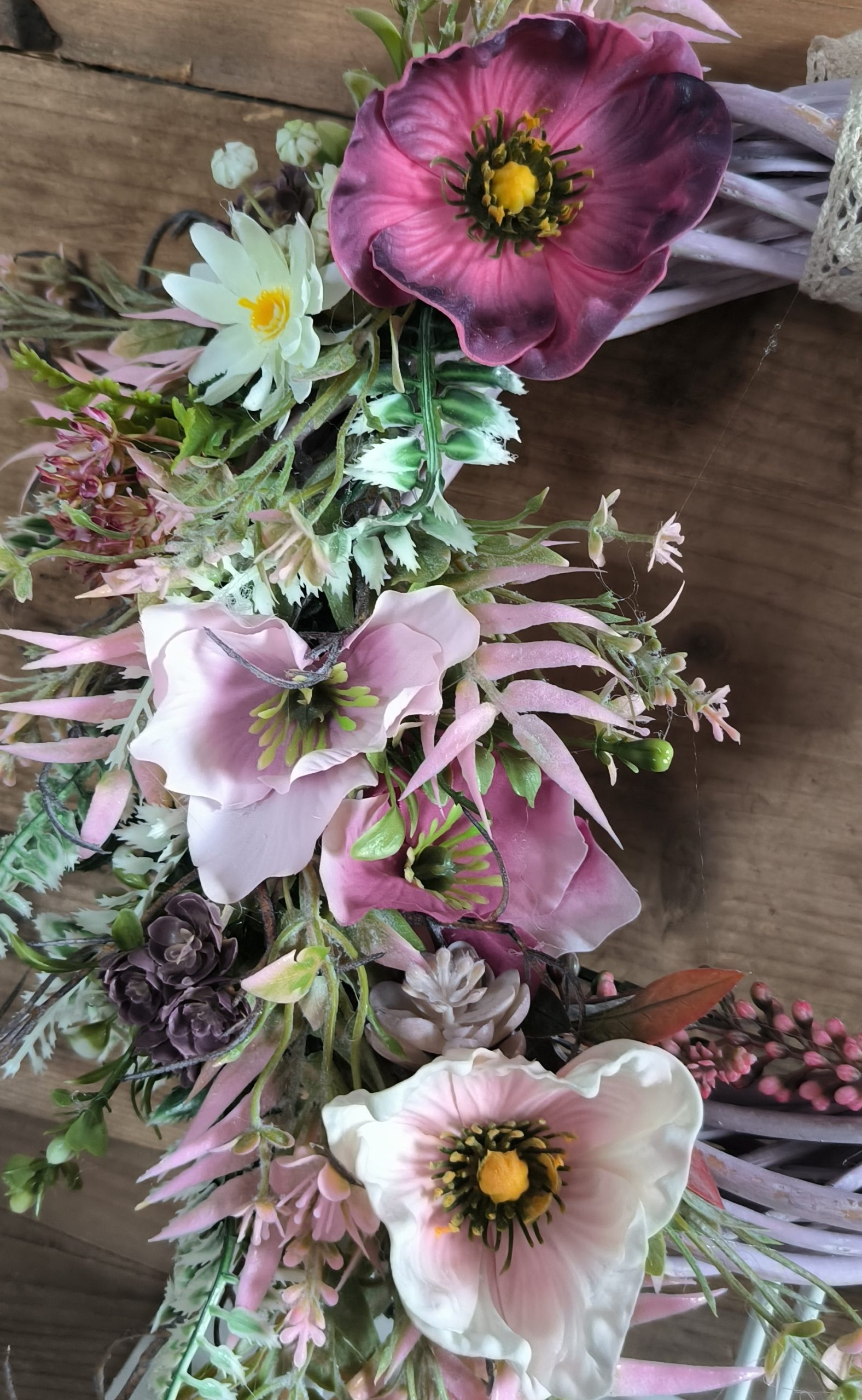 Egy igazán különleges, 25 cm-es vessző alapra készült tavaszi ajtódísz, tele lágy pasztellszínekkel és romantikus virágokkal. A finoman omló zöldek, a rózsaszínes-lilás árnyalatú virágok és a természetes hatású levelek együtt varázsolnak könnyed, friss hangulatot az otthonodba.