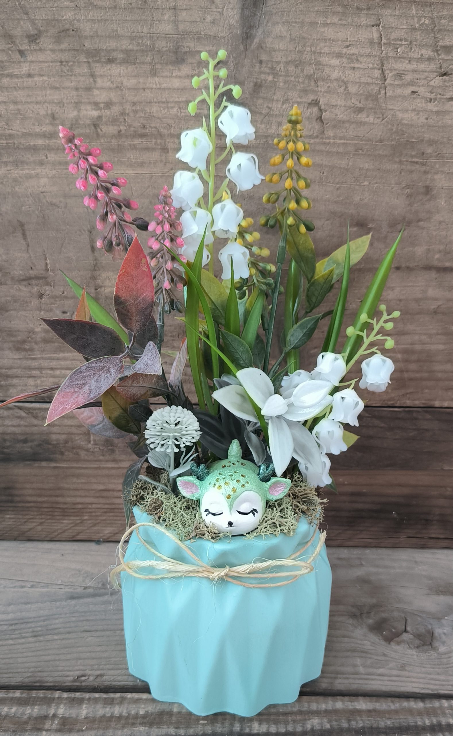 Tavaszváró őzikés dísz, türkiz kaspó